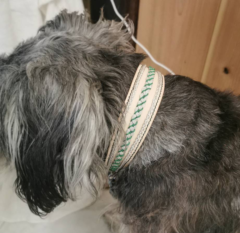 散歩🐾やお出かけのたび、首に馴染むヌメ革と手仕事で編み込んだ柔らかい糸の編み模様が、愛犬を優しく包みます🍃